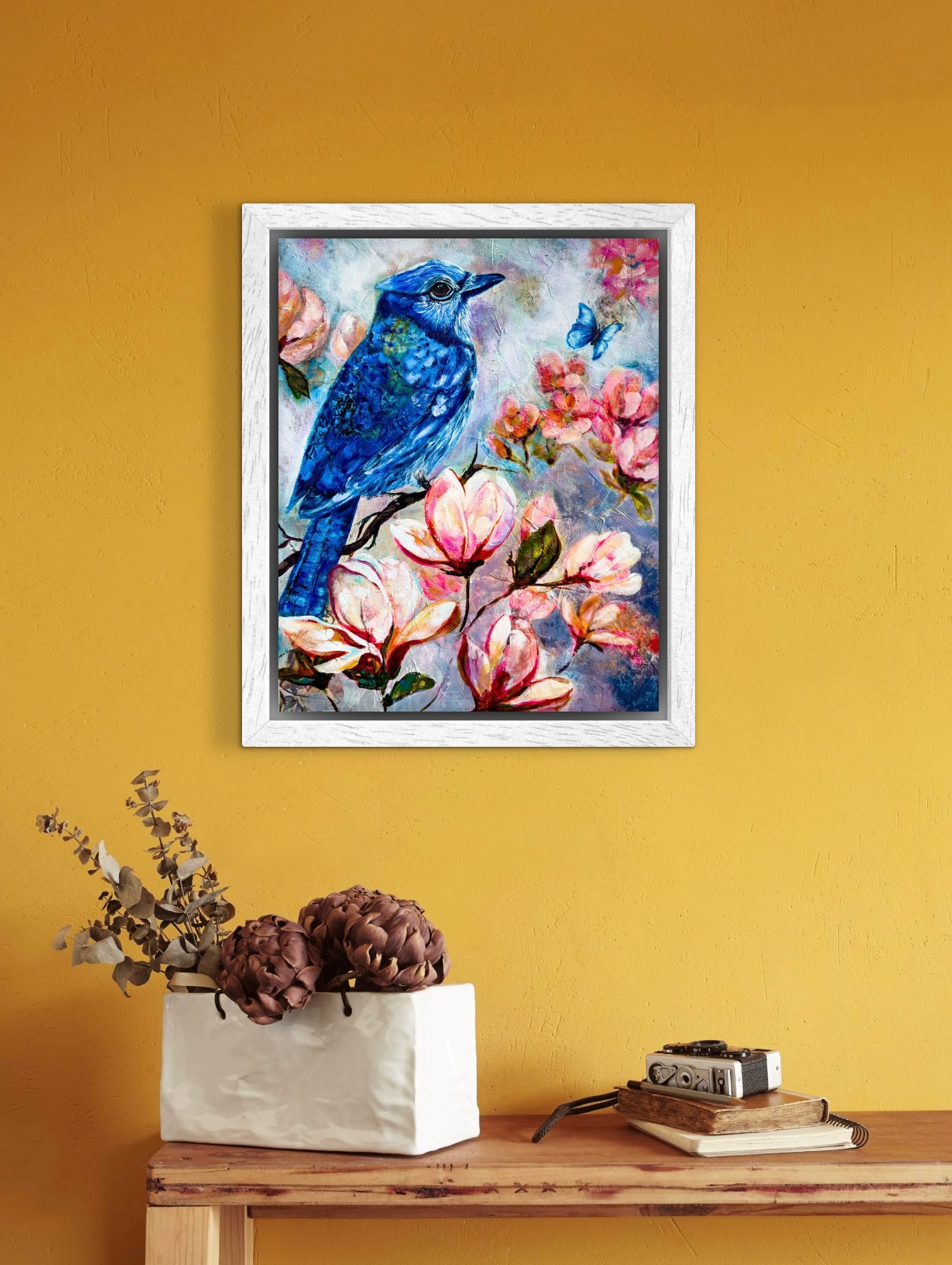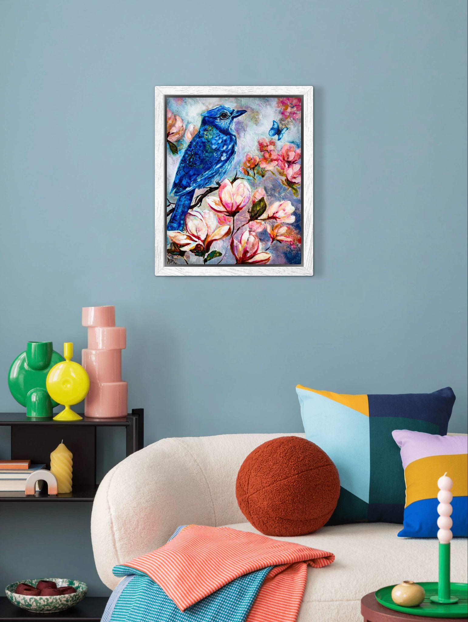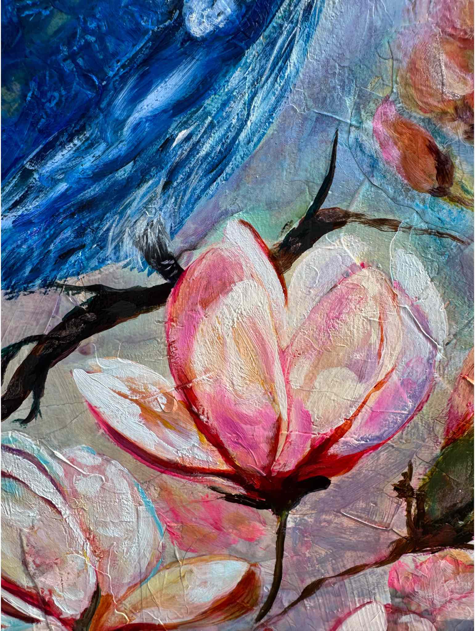 “Beyond the Flight” was born from reflection - how passion and perseverance intertwine when things don’t go as planned. As the blue jay watches a butterfly drift away among magnolias, the painting becomes a quiet meditation on resilience and renewal. Through soft layers of pinks, blues, and cream, it reminds us that endings are only pauses before another beginning.
