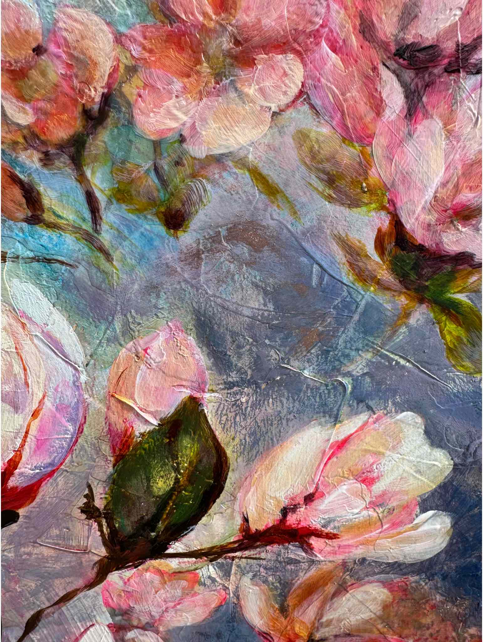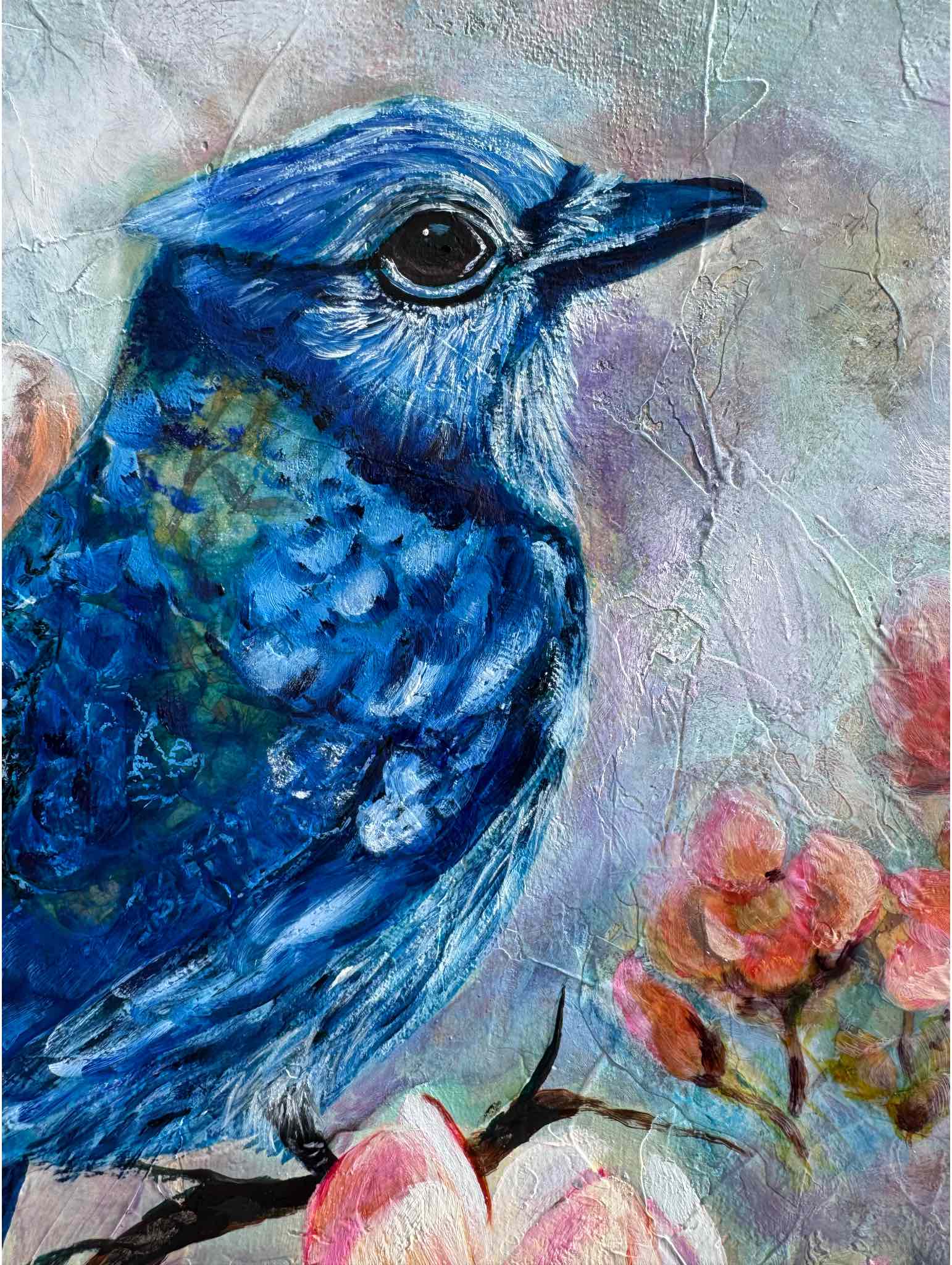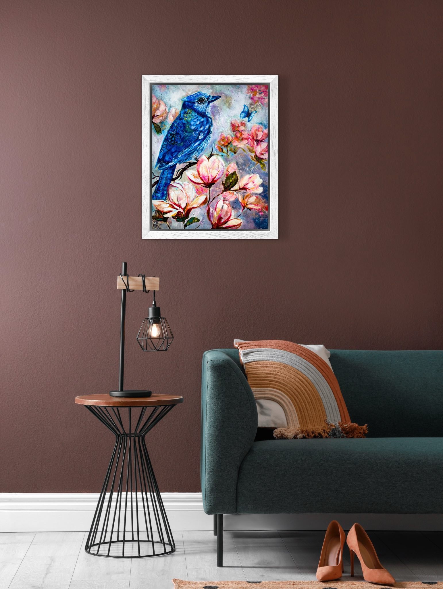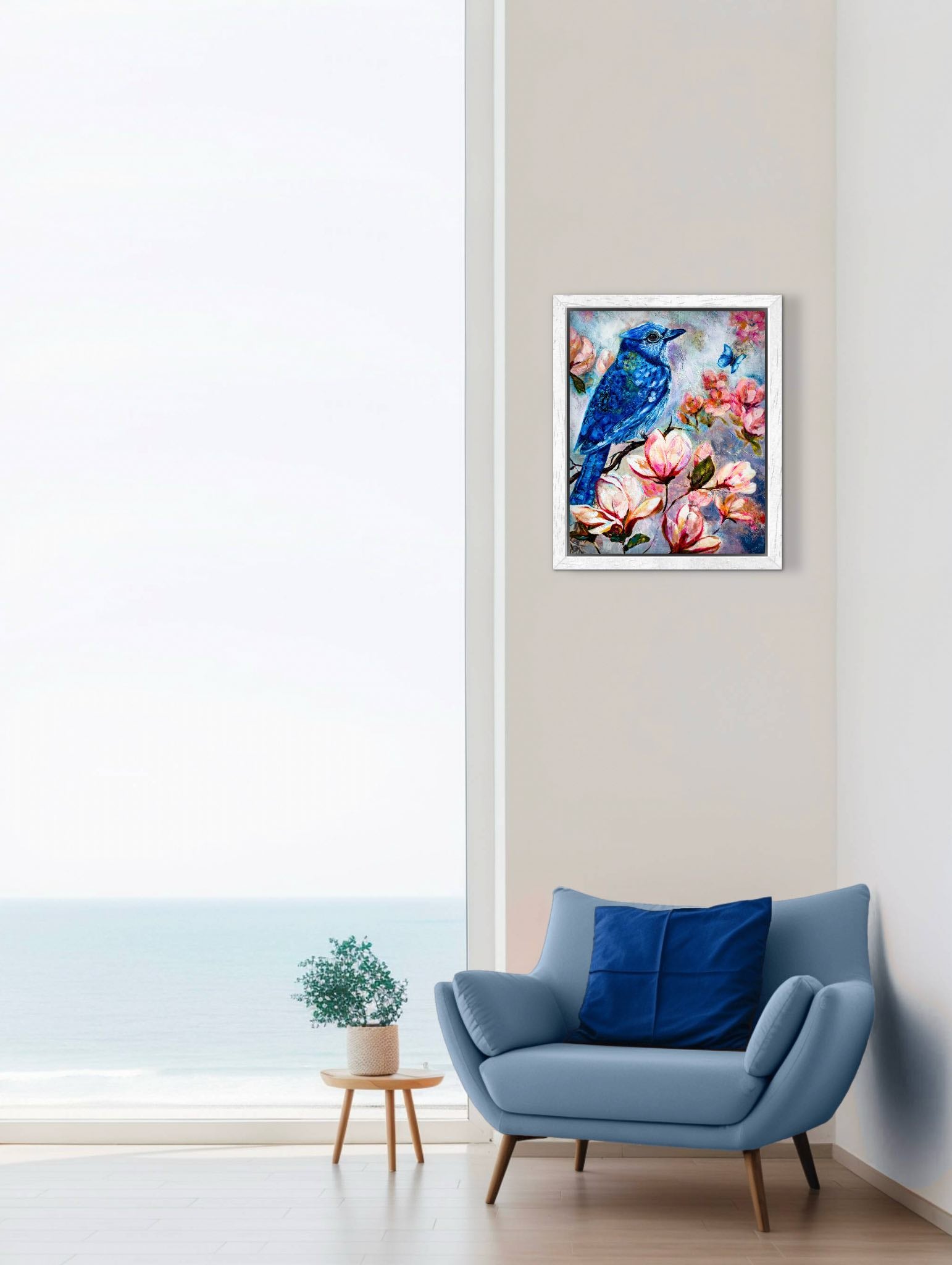 “Beyond the Flight” was born from reflection - how passion and perseverance intertwine when things don’t go as planned. As the blue jay watches a butterfly drift away among magnolias, the painting becomes a quiet meditation on resilience and renewal. Through soft layers of pinks, blues, and cream, it reminds us that endings are only pauses before another beginning.