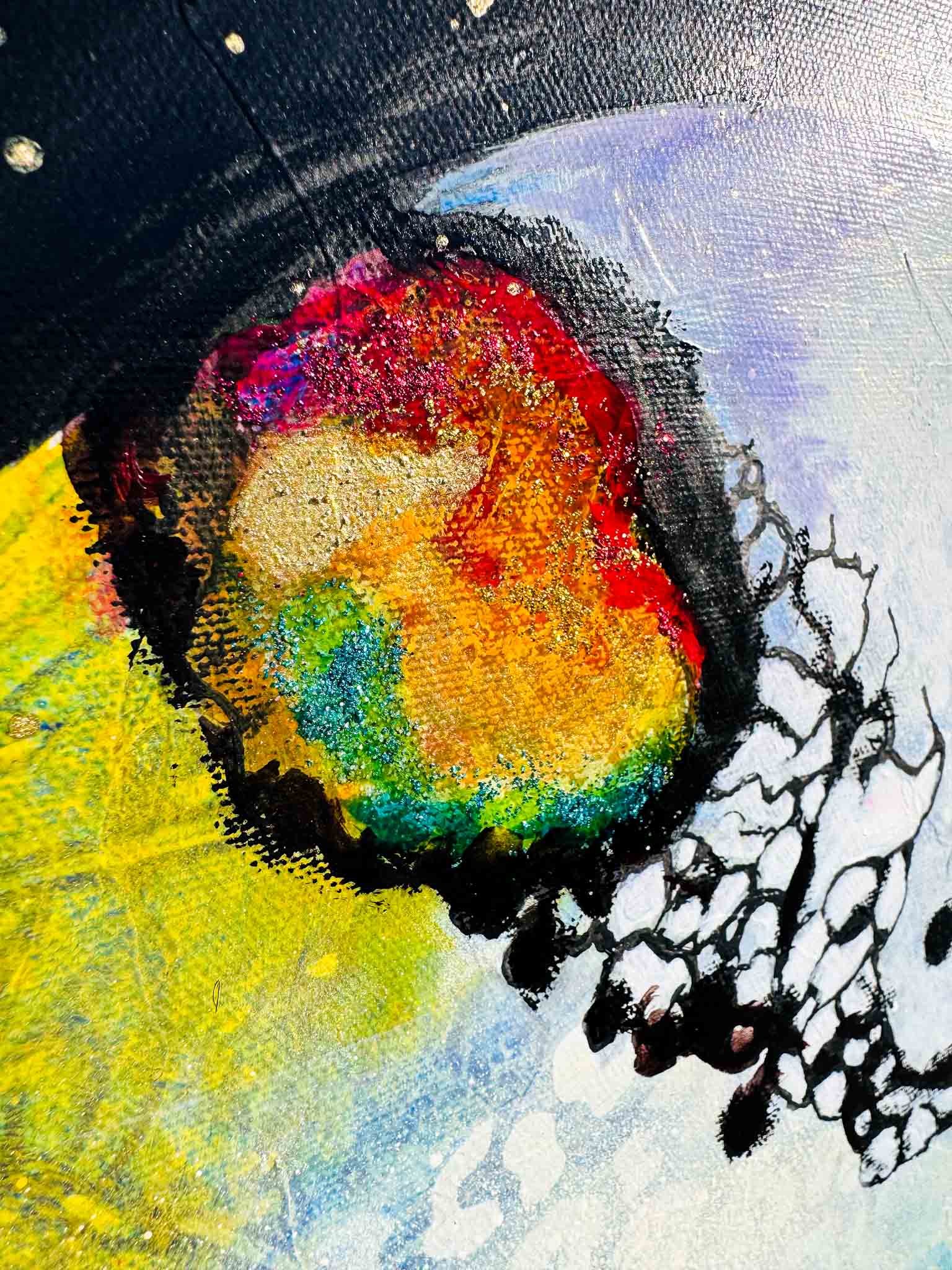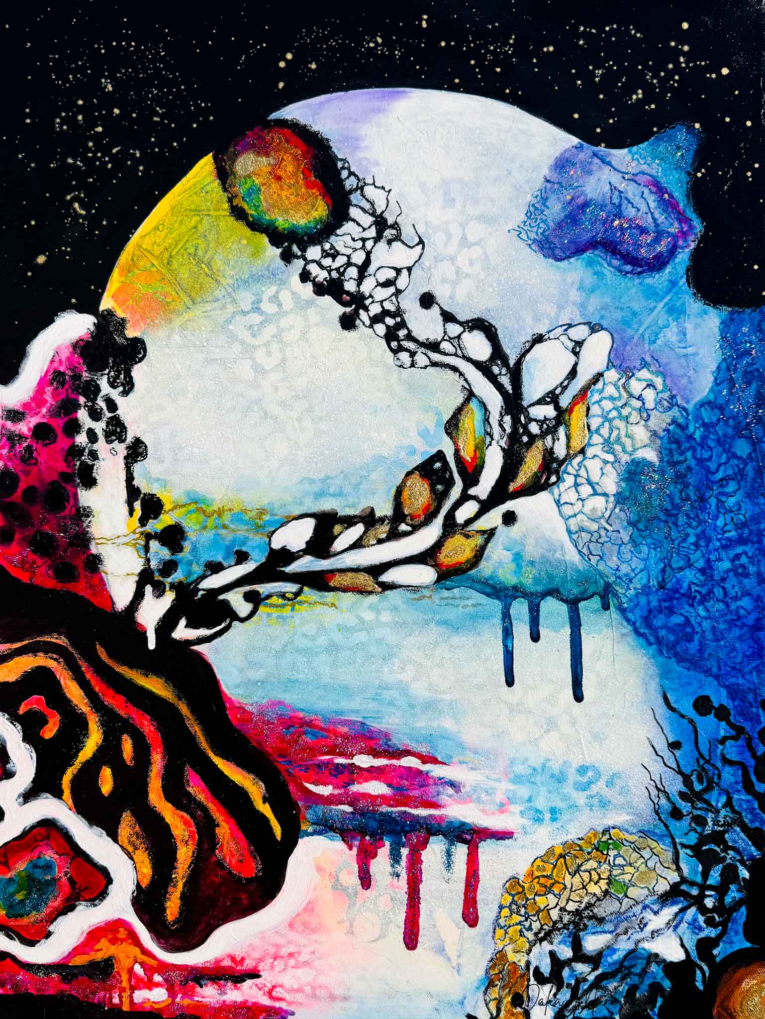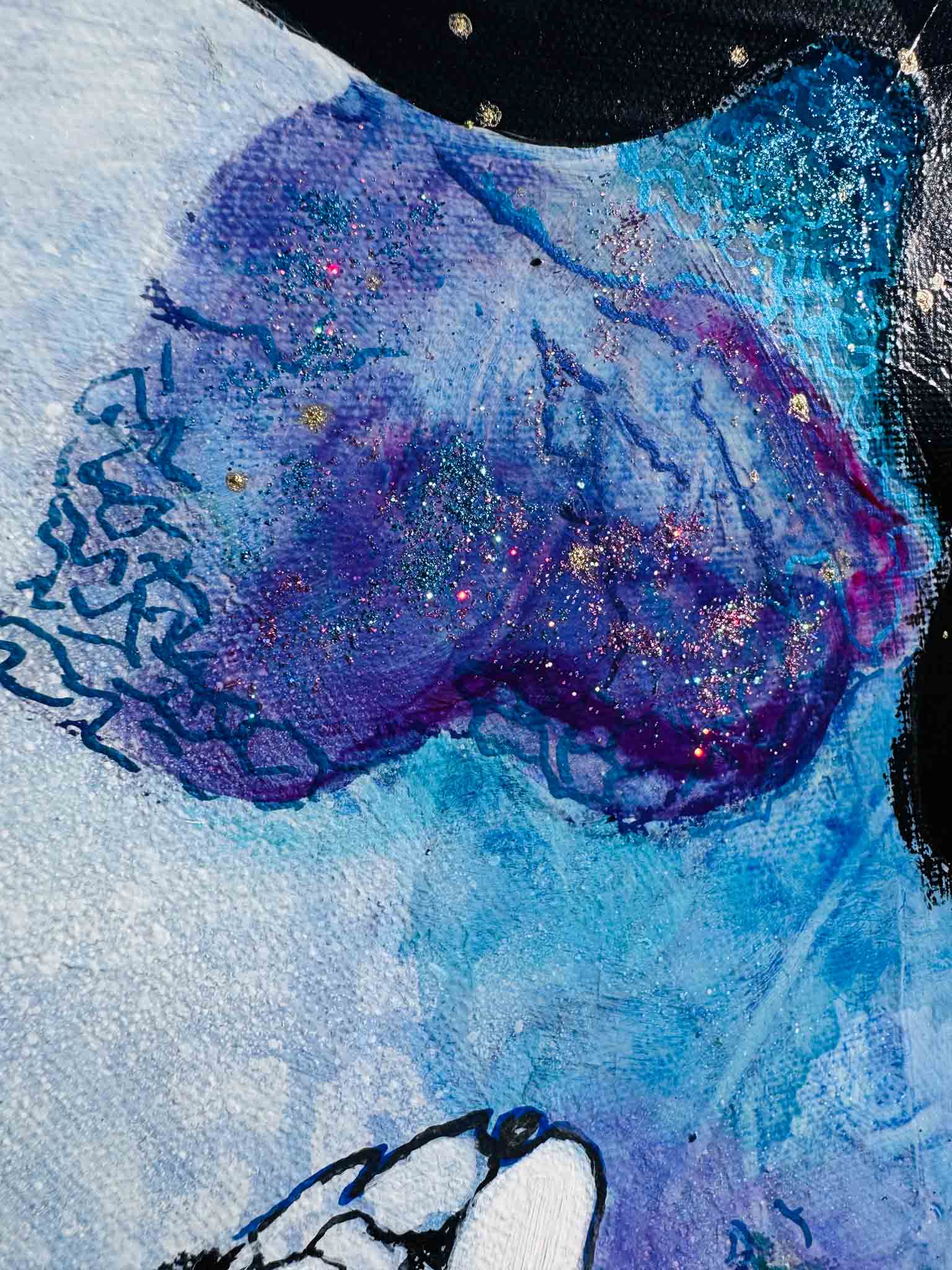 "Celestial Dance" is the continuation of the "Water's Embrace" in my "Water and Fire" collection. This painting transports us into the mysteries of the universe, blending the elements of water and fire with touches of gold and shimmering paint.