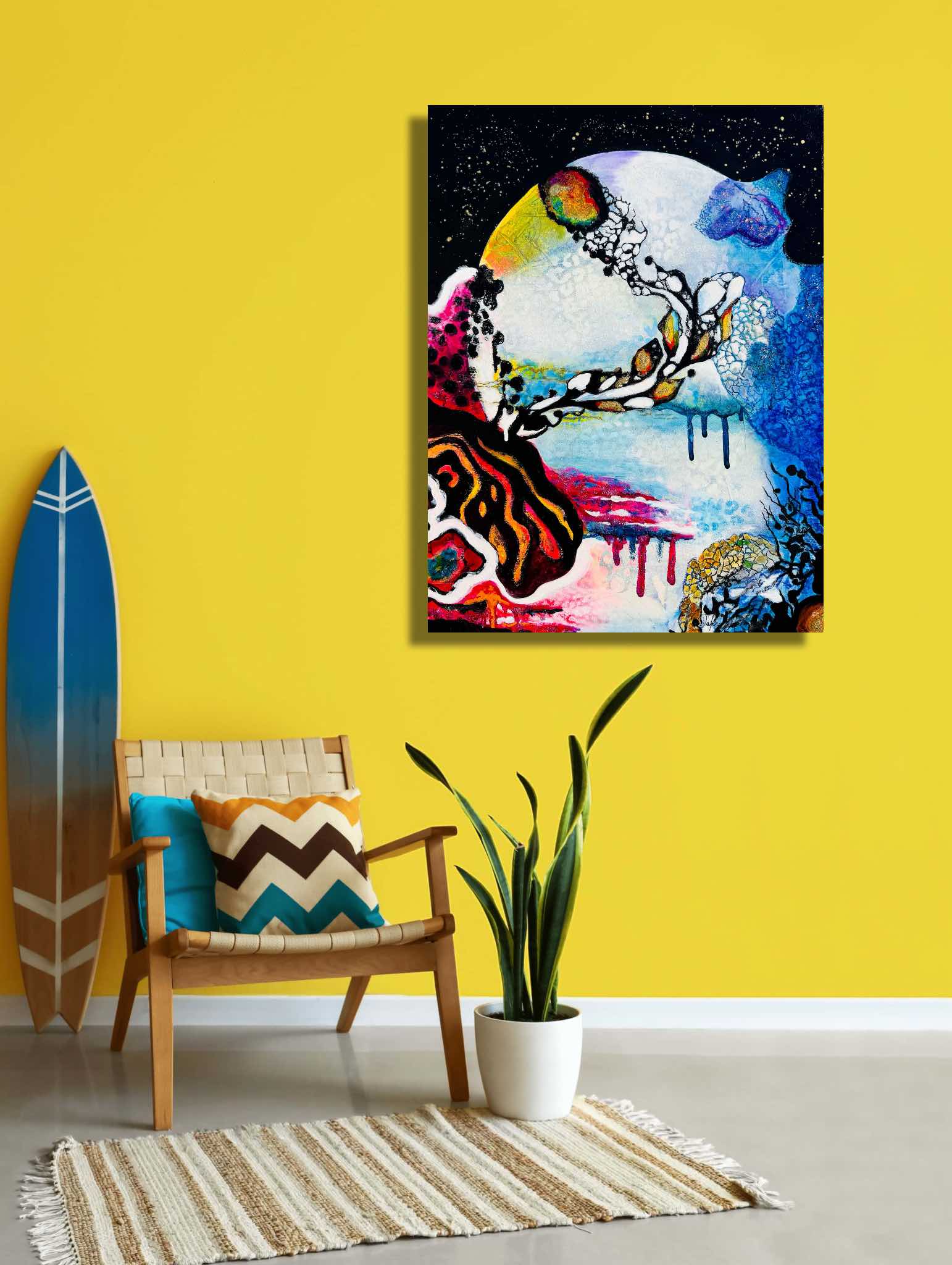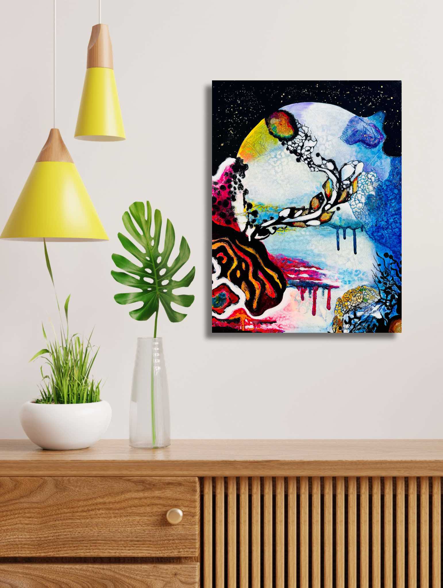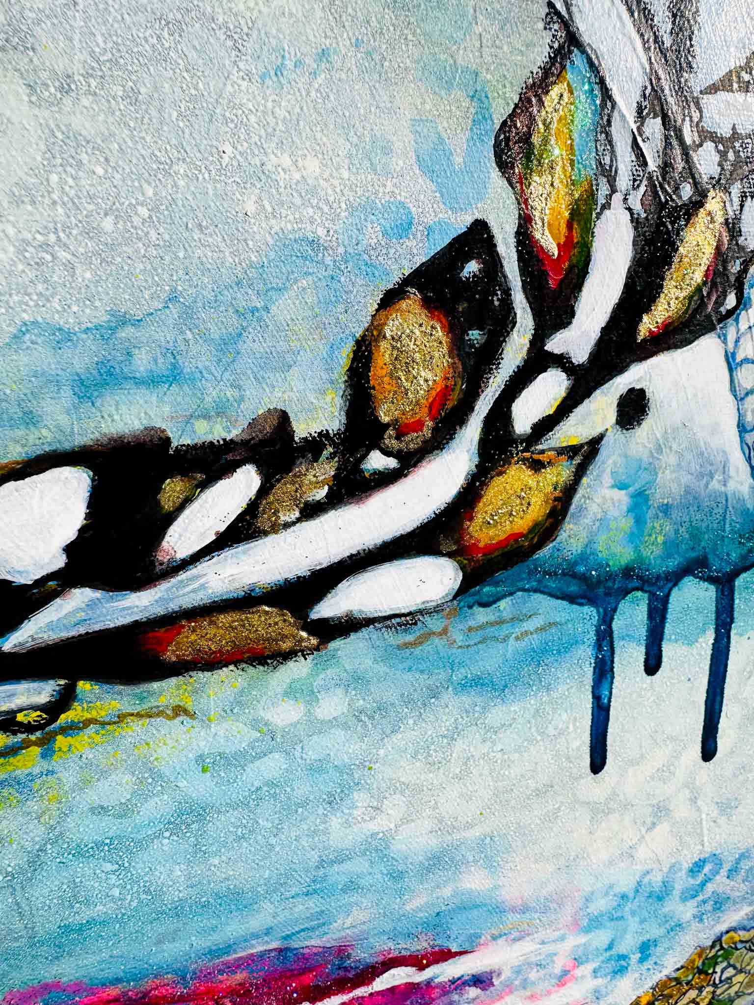 "Celestial Dance" is the continuation of the "Water's Embrace" in my "Water and Fire" collection. This painting transports us into the mysteries of the universe, blending the elements of water and fire with touches of gold and shimmering paint.