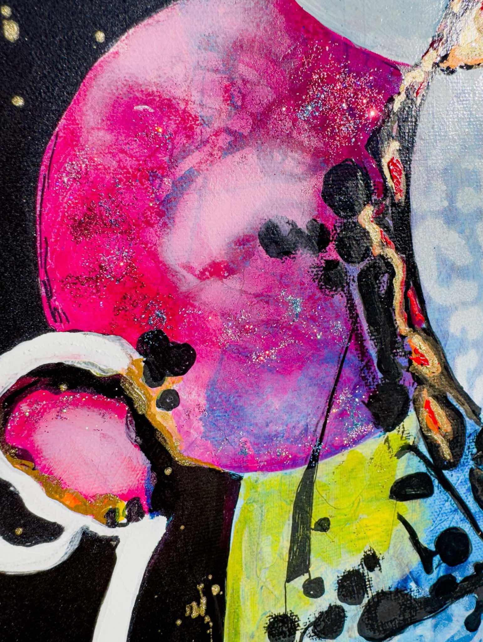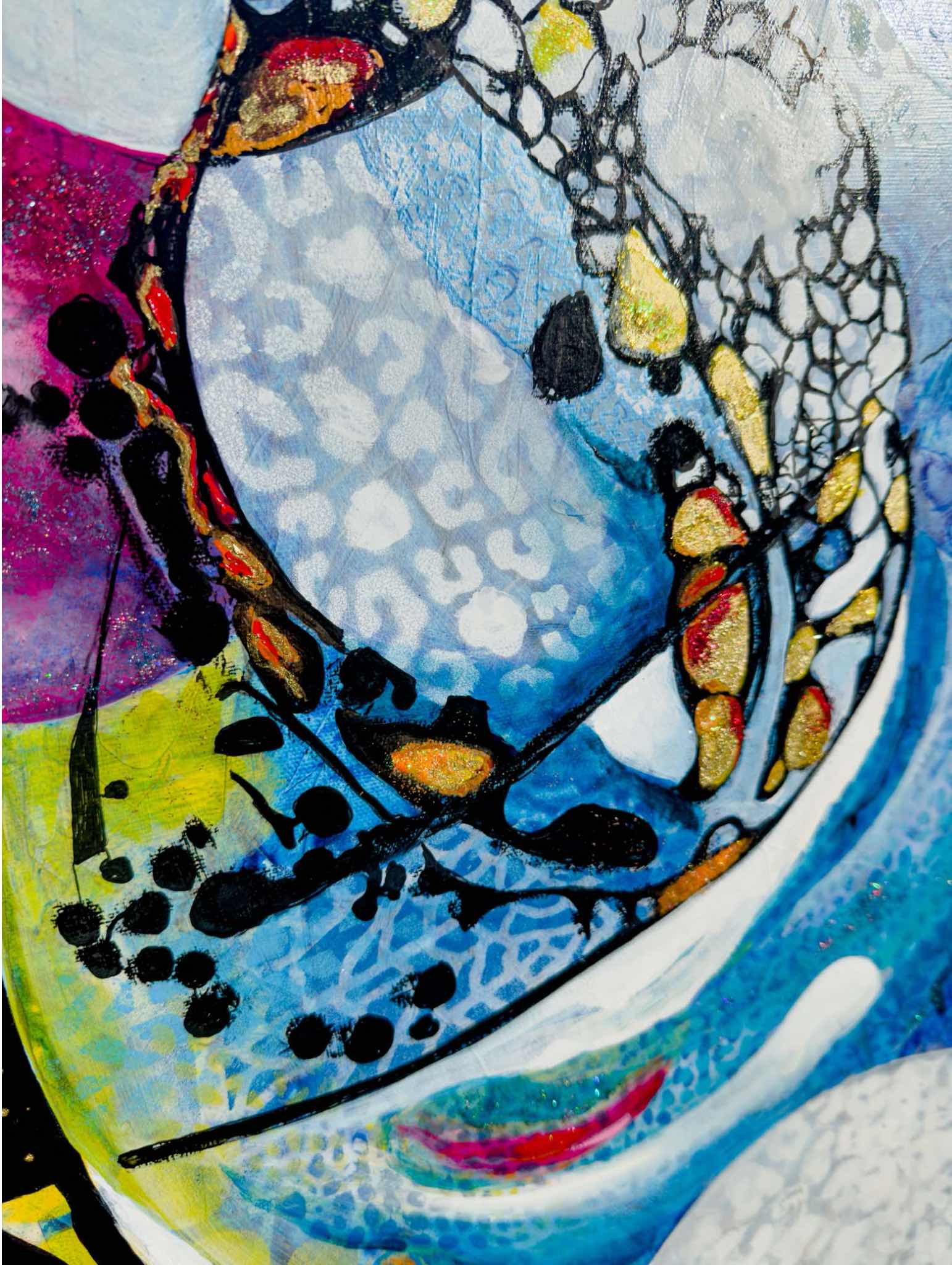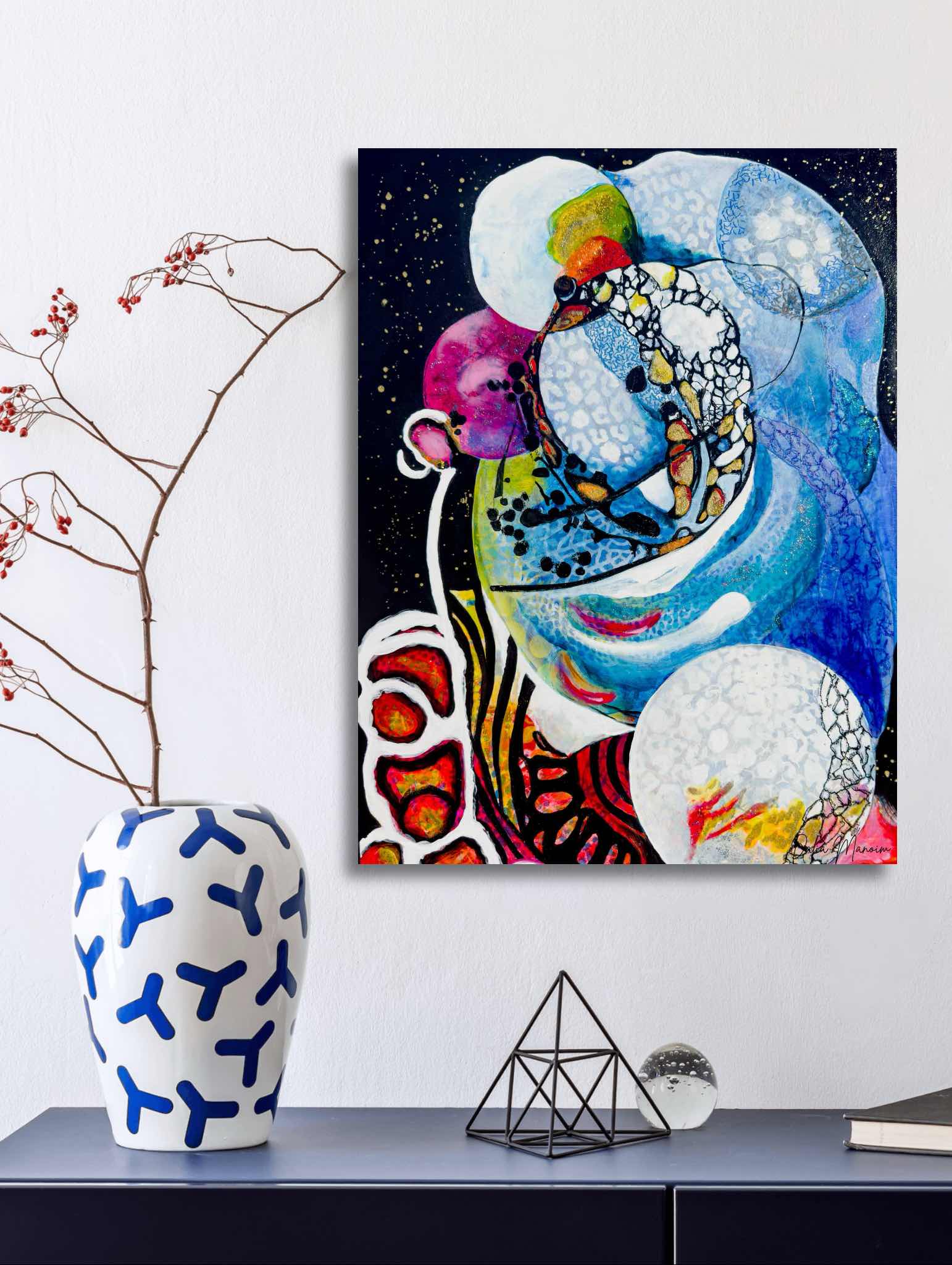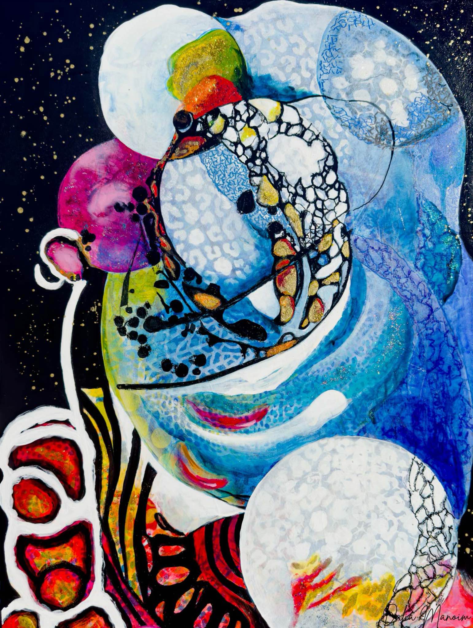 "Moonlight Serenity" is the continuation of "Water's Embrace" in my "Water and Fire" collection, with the moon as the guiding light at its center. Just as the moon governs the tides, reminding us of life's ups and downs, my painting reflects the resilience we embody through our challenges. The ebb and flow of water and fire are enhanced by touches of gold and shimmering paint, symbolizing hope and renewal.