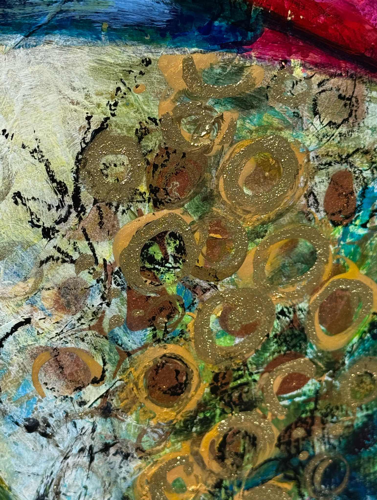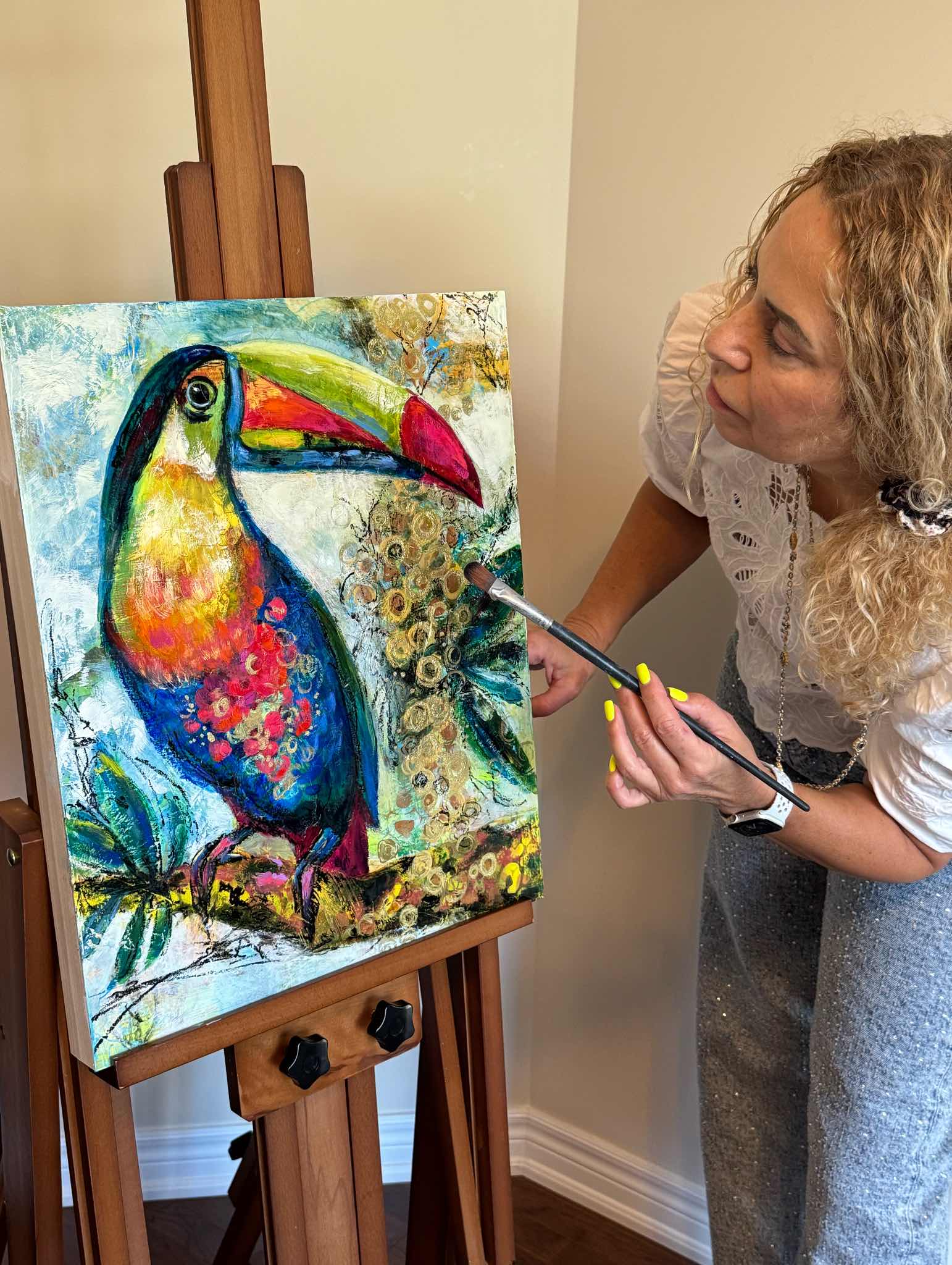 As the toucan takes shape on the branch, I imagine it watching a horizon I cannot yet see. The golden ringlets are not decoration but light gathered from small victories: conversations I had when silence felt safer; mornings I kept painting even when the world said pause. Those circles shimmer like coins of lived experience; they’re not trophies, only reminders that persistence accumulates into glow.