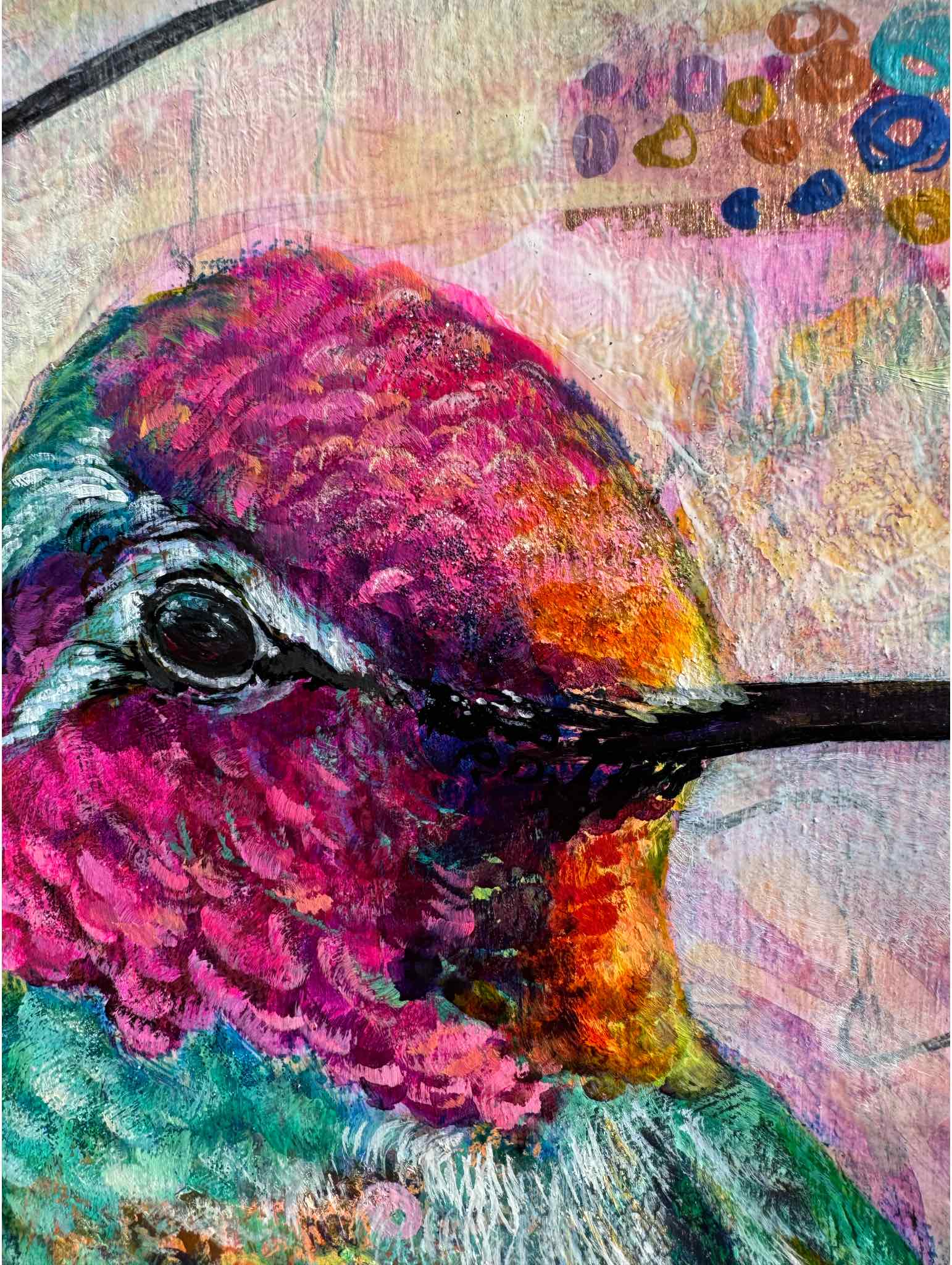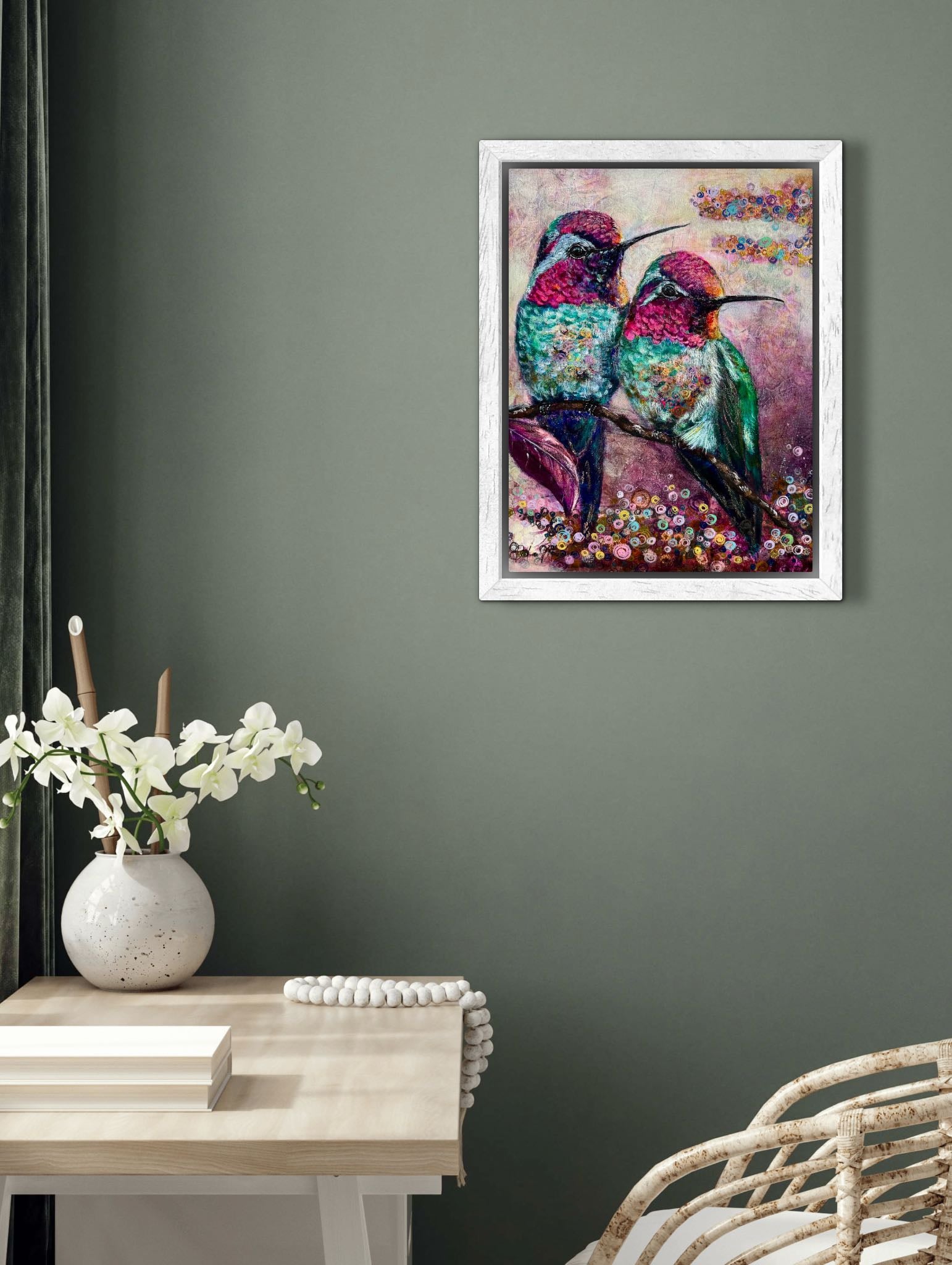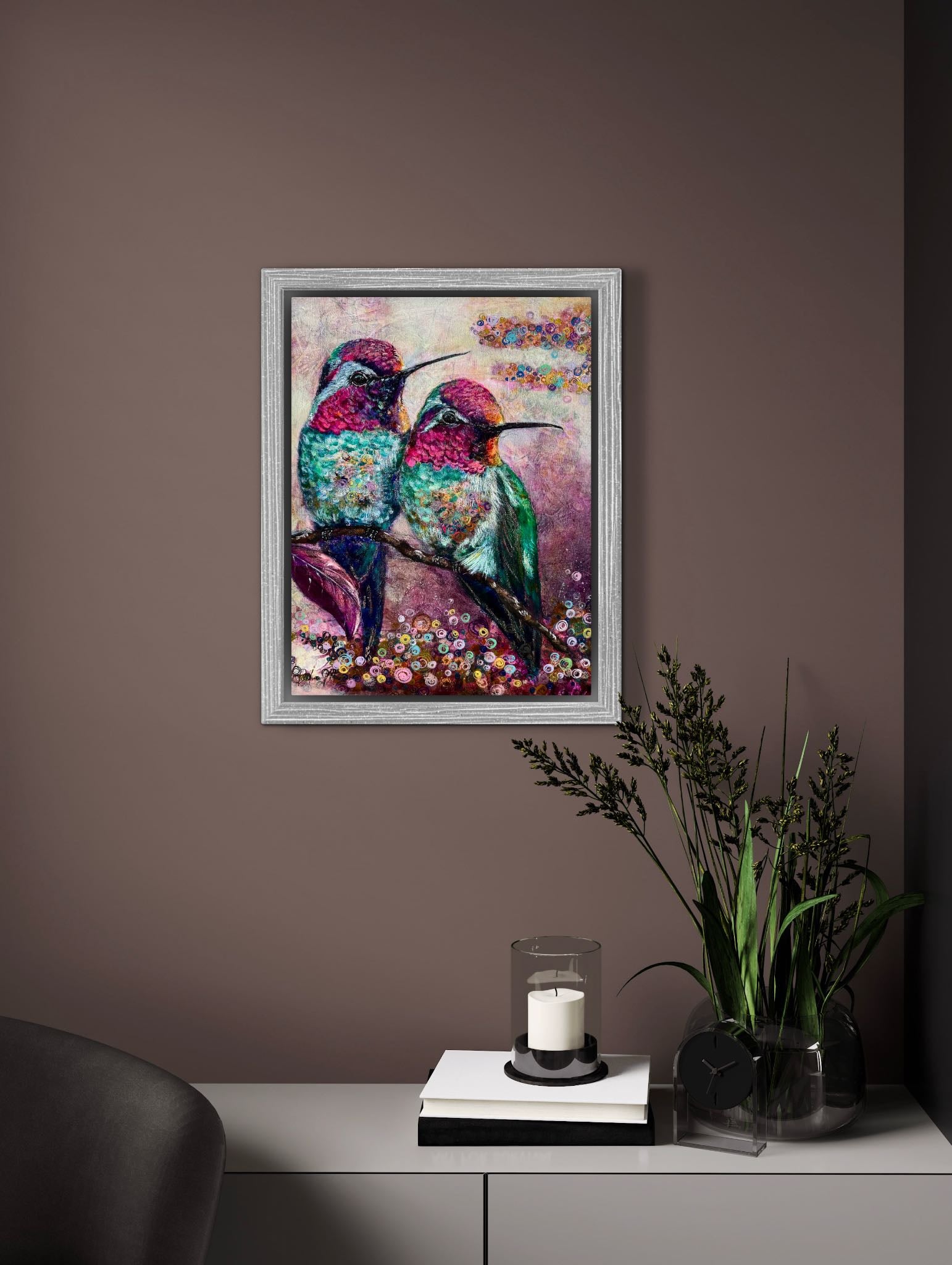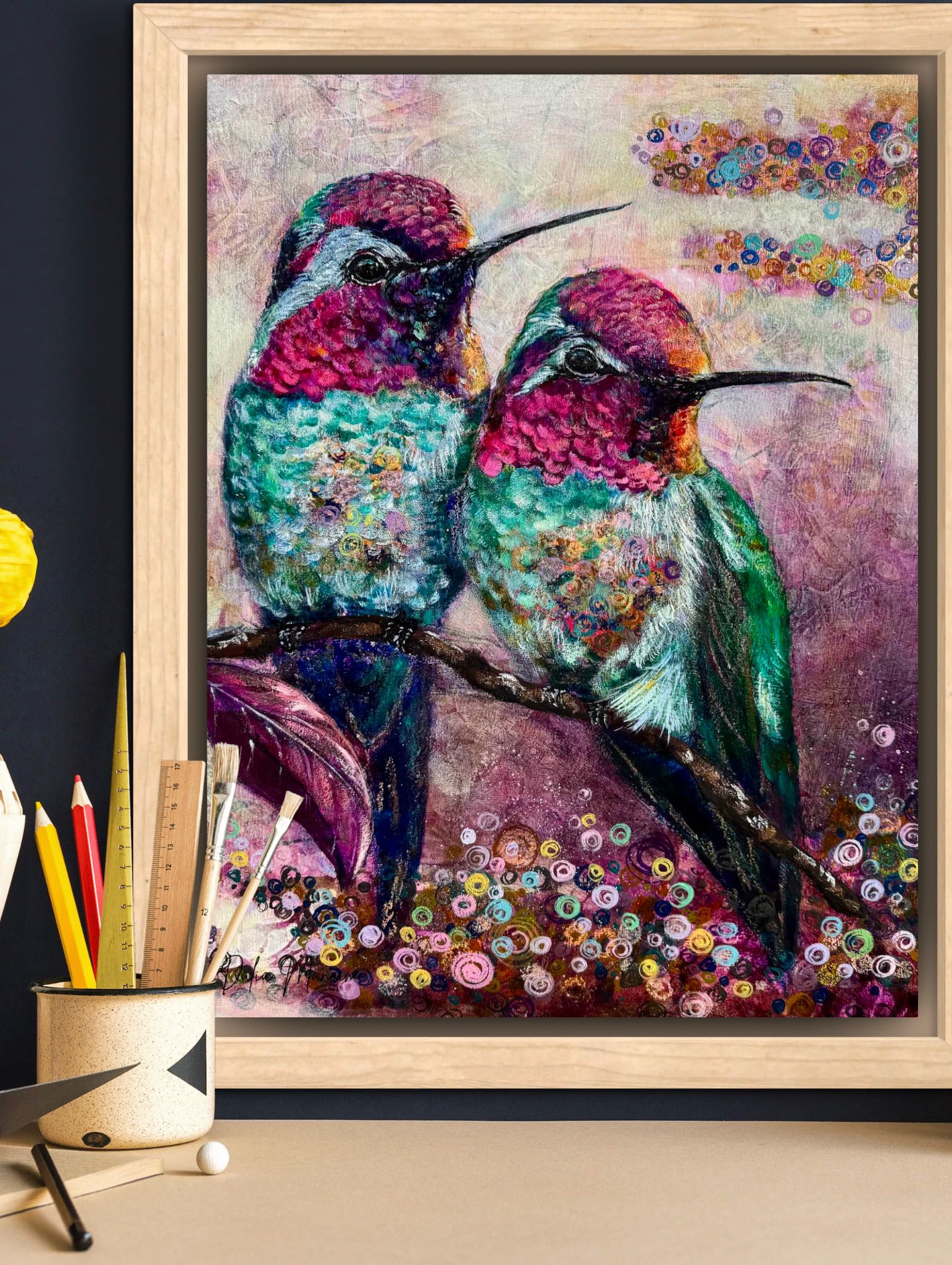 In “Shared Silence”, two hummingbirds - usually fierce and solitary - rest side by side in a moment of rare harmony. Painted in teal, magenta, and gold on birch wood panel, this mixed media oil artwork reflects peace, connection, and the quiet grace of togetherness.