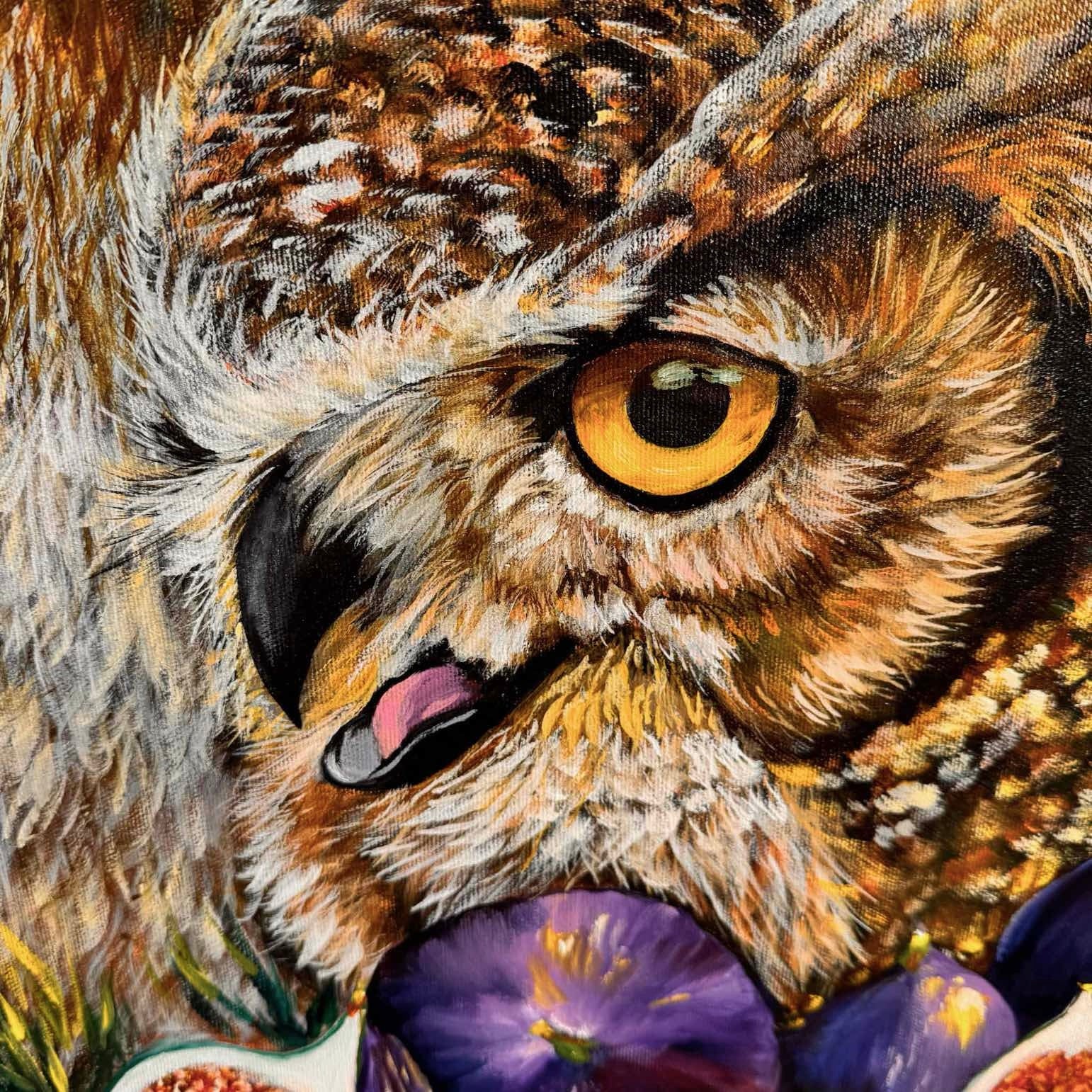 An owl stands amazed, with eyes wide and bright,