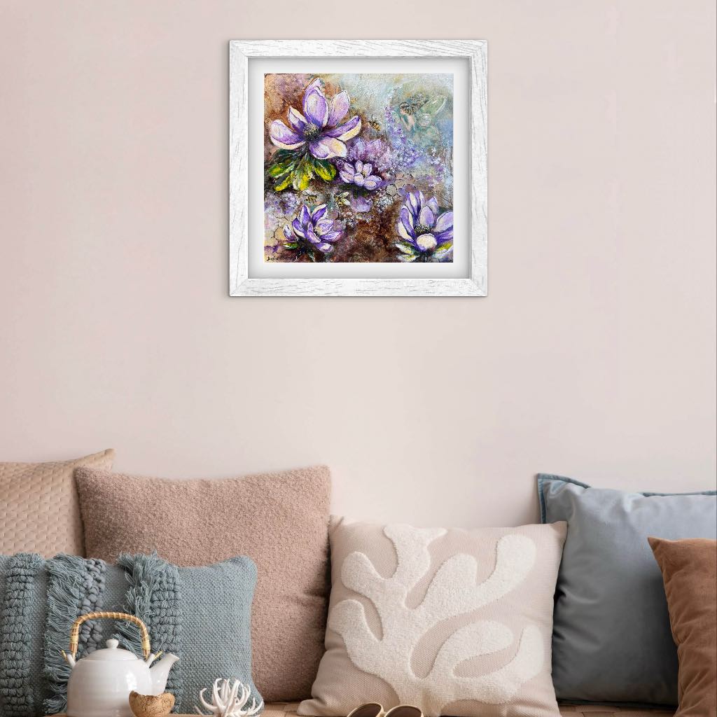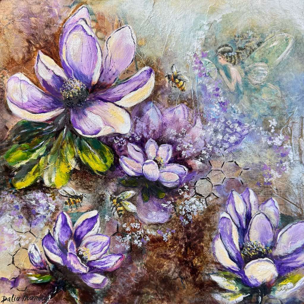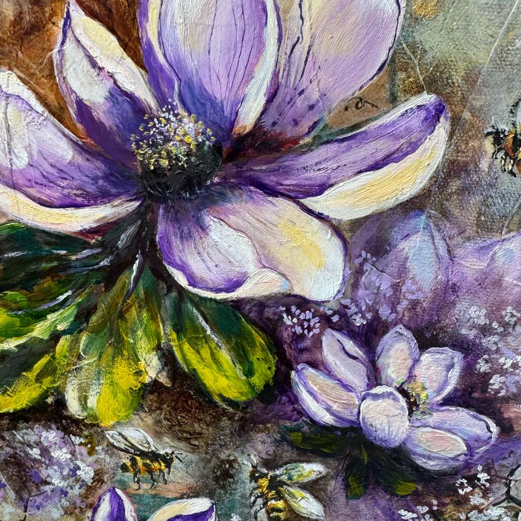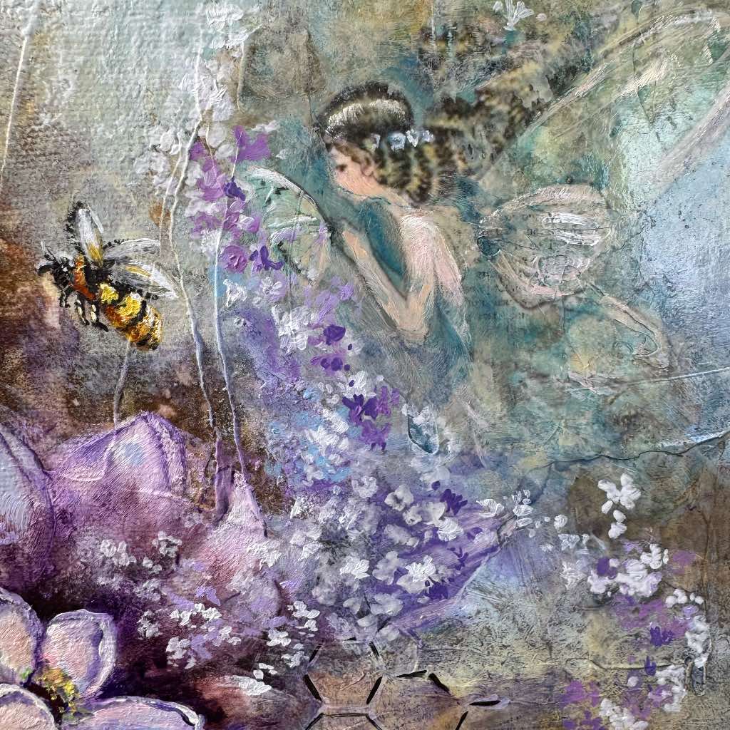 “Where the Magic Begins” started without a plan - just the quiet belief that my little fairy would create something beautiful. I’ve always loved bees: their purpose, their gentleness, the way they carry a kind of magic on tiny wings. As the layers of paint and texture grew, something unexpected bloomed. The canvas shifted, the colors opened, and the whole piece took on a life I didn’t see coming. It felt like watching magic step forward.